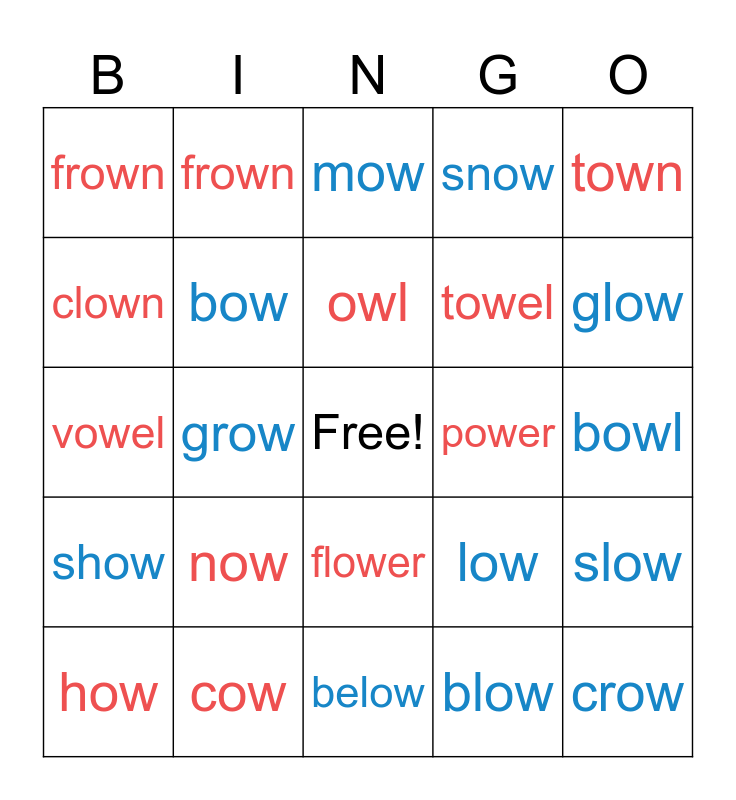 This bingo card has a free space and 24 words: now, cow, owl, how, town, frown, clown, frown, power, flower, towel, vowel, low, slow, bow, blow, bowl, mow, glow, grow, crow, show, snow and below.