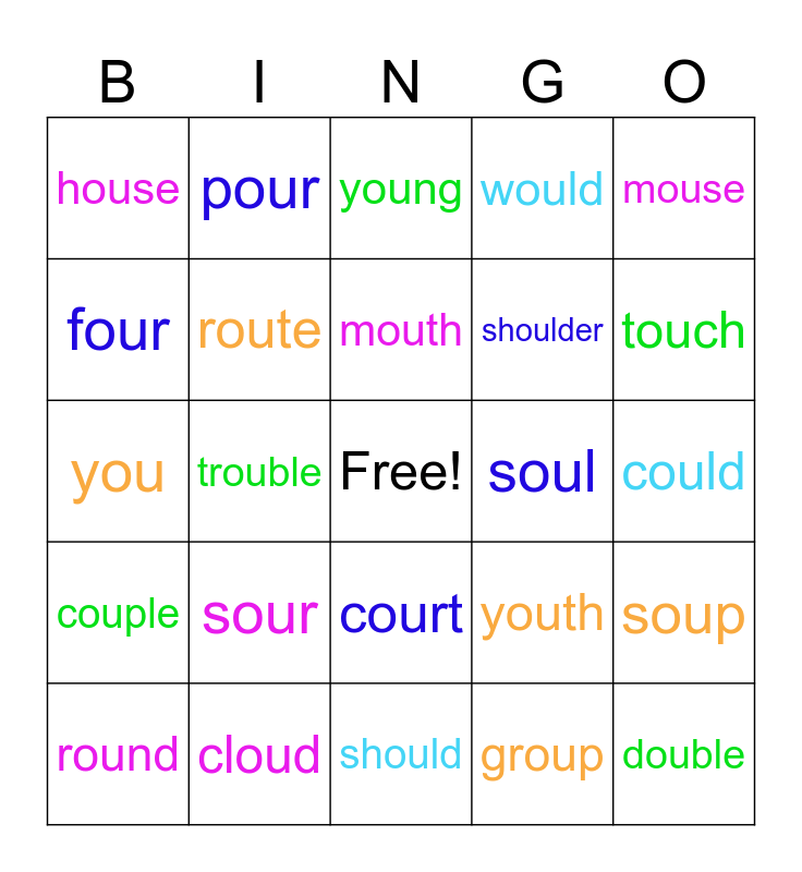 This bingo card has a free space and 24 words: sour, cloud, mouth, round, mouse, house, four, pour, soul, court, shoulder, you, youth, soup, route, group, could, young, touch, trouble, double, couple, would and should.