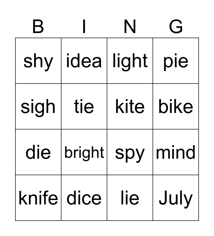 This bingo card has 24 words: Free!, giant, bike, lime, sigh, shy, tie, idea, dice, cry, die, spy, high, lion, kite, fly, lie, light, bright, mind, knife, July, pie and night.