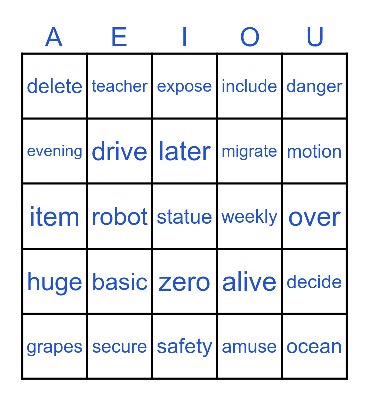 This bingo card has 25 words: basic, safety, later, grapes, danger, delete, evening, teacher, weekly, zero, migrate, item, alive, decide, drive, ocean, over, expose, motion, robot, statue, secure, huge, include and amuse.