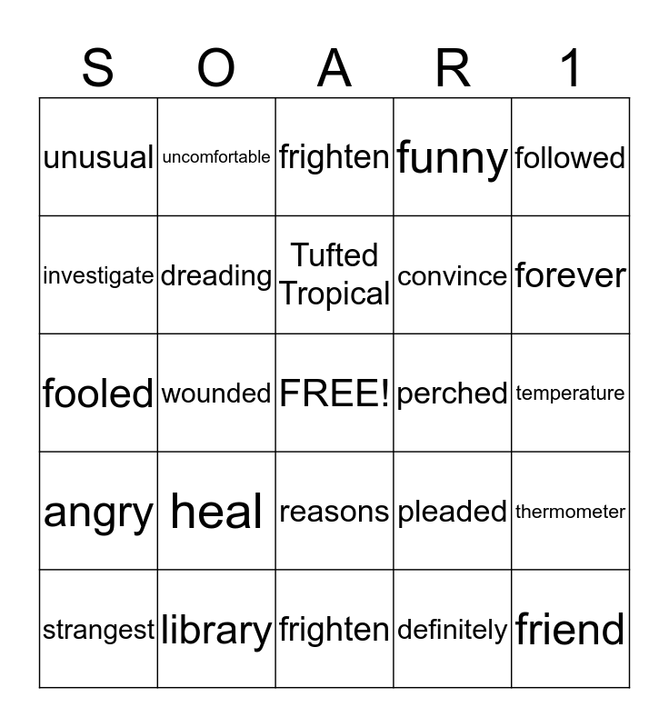 This bingo card has a free space and 24 words: heal, library, Tufted Tropical, strangest, followed, unusual, investigate, uncomfortable, perched, reasons, convince, fooled, pleaded, thermometer, dreading, definitely, temperature, frighten, forever, wounded, friend, angry, funny and frighten.