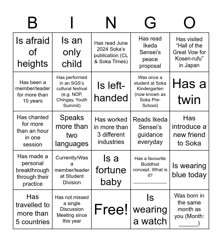 This bingo card has 29 words: Has travelled to more than 5 countries, Does morning and evening gongyo everyday, Speaks more than two languages, Was born in the same month as you (Month: ______), Is afraid of heights, Has read June 2024 Soka’s publication (CL & Soka Times), Has performed in an SGS’s cultural festival (e.g. NDP, Chingay, Youth Summit), Currently/Was a member/leader at Student Division, Reads Ikeda Sensei’s guidance everyday, Has not missed a single Discussion Meeting since this year, Has introduce a new friend to Soka, Has worked in more than 3 different industries, Free!, Is wearing a watch, Has a twin, Owns a copy of "The New Human Revolution”, Is a fortune baby, Has made a personal breakthrough through their practice, Has visited “Hall of the Great Vow for Kosen-rufu” in Japan, Has chanted for more than an hour in one session, Has a favourite Buddhist concept. What is it? _____________, Prefers tea over coffee, Was once a student at Soka Kindergarten (now known as Soka Pre-School), Has been a member/leader for more than 10 years, Has read Ikeda Sensei’s peace proposal, Is an only child, Is wearing blue today, Is left-handed and Currently/Was a member or IC in Future Division.