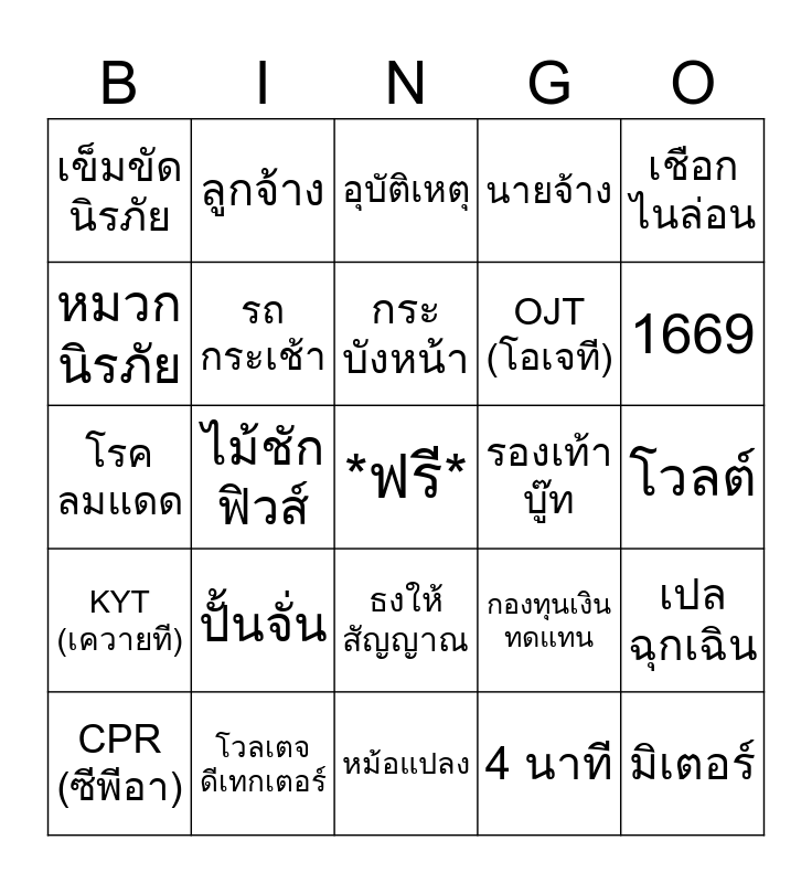 This bingo card has a free space and 29 words: CPR (ซีพีอา), คลาส อี, ไม้ชักฟิวส์, กรวยจราจร, เข็มขัดนิรภัย, อุบัติเหตุ, รถกระเช้า, ปั้นจั่น, รองเท้าบู๊ท, โวลเตจ ดีเทกเตอร์, โวลต์, มิเตอร์, หม้อแปลง, 4 นาที, 1669, ถุงมือแรงสูง, ธงให้สัญญาณ, KYT (เควายที), เชือกไนล่อน, โรค ลมแดด, กองทุนเงินทดแทน, ช็อต กราวน์, OJT (โอเจที), หมวกนิรภัย, นายจ้าง, ลูกจ้าง, เปลฉุกเฉิน, กระบังหน้า and 4 เมตร.