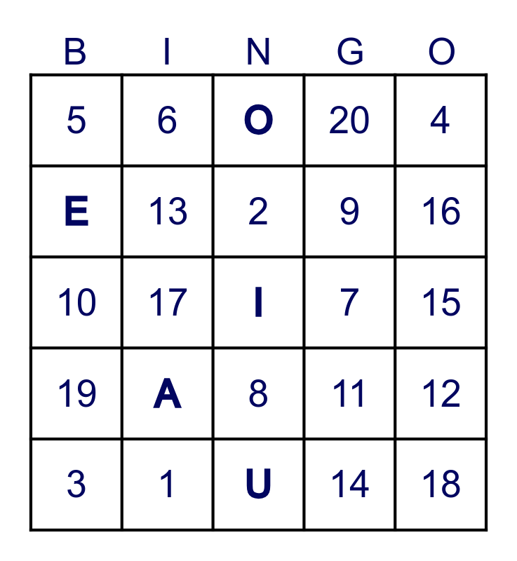 This bingo card has a free space and 24 words: A, 1, 2, 3, 4, 5, E, 6, 7, 8, 9, 10, 11, 12, 13, 14, 15, O, 16, 17, 18, 19, 20 and U.