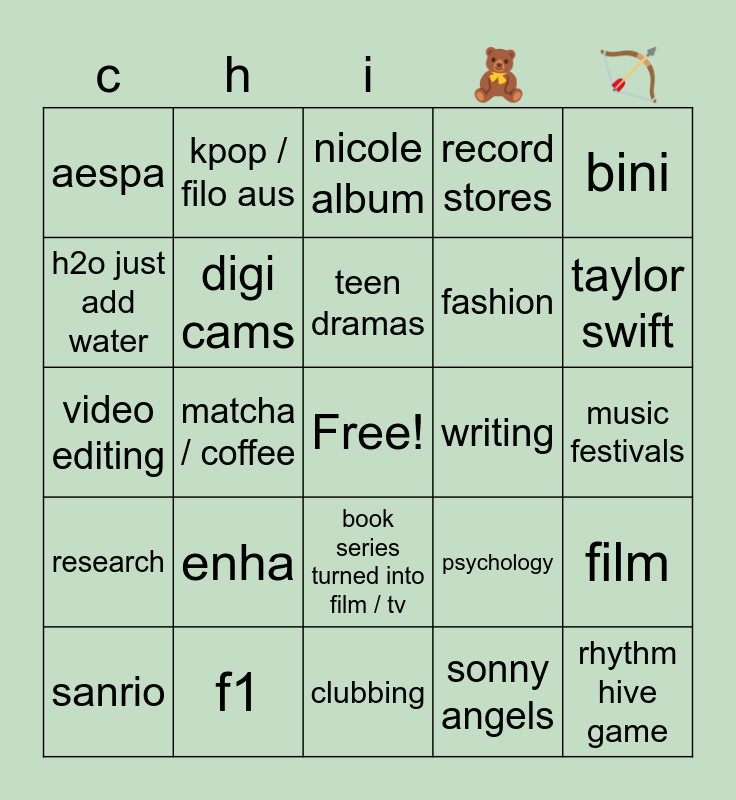 This bingo card has a free space and 24 words: enha, f1, teen dramas, sanrio, bini, aespa, h2o just add water, kpop / filo aus, writing, book series turned into film / tv, fashion, video editing, psychology, film, digi cams, sonny angels, music festivals, nicole album, taylor swift, matcha / coffee, rhythm hive game, research, record stores and clubbing.