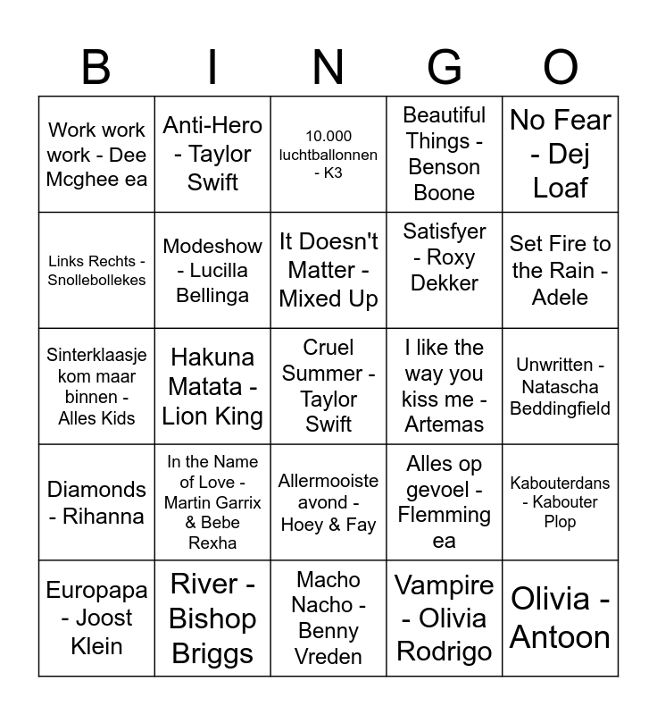 This bingo card has a free space and 54 words: Sugardaddy - Roxy Dekker, Diamonds - Rihanna, As it Was - Harry Styles, Training Season - Dua Lipa, Allermooiste avond - Hoey & Fay, End of Beginning - Djo, Beautiful Things - Benson Boone, It's not right But it's Okay - Mr. Belt & Wezol, Links Rechts - Snollebollekes, Greedy - Tate McRae, Work work work - Dee Mcghee ea, Water - Tyla, River - Bishop Briggs, Europapa - Joost Klein, Loco Loco - Alessio & Sluwe Ollie, Macho Nacho - Benny Vreden, Olivia - Antoon, Satisfyer - Roxy Dekker, Watermelon Sugar - Harry Styles, Unwritten - Natascha Beddingfield, Alles op gevoel - Flemming ea, The Code - Nemo, I like the way you kiss me - Artemas, No Fear - Dej Loaf, Anne-Fleur vakantie - Roxy Dekker, Anti-Hero - Taylor Swift, Stukje van mij - Meau, Stick Season - Noah Kahan, Tell Ur Girlfriend - Lay Bankz, Vampire - Olivia Rodrigo, Dinnershow - Benny Vreden, Texas Hold 'em - Beyonce, Brommers kieken - Boer Harm, All I want for xmas is You - Mariah Carey, 10.000 luchtballonnen - K3, Work Work Work - JW Velly, Sinterklaasje kom maar binnen - Alles Kids, Kabouterdans - Kabouter Plop, Loïs, dit is je verjaardag - Cadeautje voor jou, Modeshow - Lucilla Bellinga, Karma - JoJo Siwa, Lush Life - Zara Larsson, Boomerang - Jojo Siwa, Huis op stelten - De Bellinga's, In the Name of Love - Martin Garrix & Bebe Rexha, Duimpje Omhoog - Luan Bellinga, Feesten - Infinity, Daba Die Daba Daa - Kinderen voor kinderen, It Doesn't Matter - Mixed Up, Hakuna Matata - Lion King, Set Fire to the Rain - Adele, Yes, and? - Ariana Grande, Durf Niet - Wesley & Lynn and Talk About Us - Thierry von der Warth.
