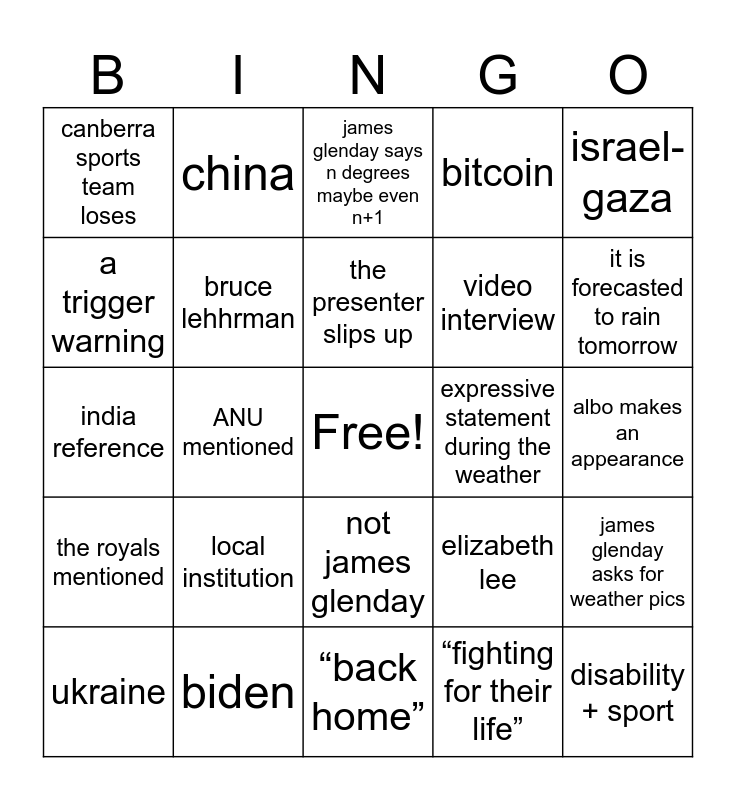 This bingo card has a free space and 44 words: olympics, disability + sport, rachael puppazoni, ukraine, gay, “fighting for their life”, james glenday says n degrees maybe even n+1, david pocock/ bald white guy that looks similar, israel-gaza, biden, bitcoin, expressive statement during the weather, not james glenday, local institution, they cut off someone speaking, “back home”, trump, india reference, dead white woman, it is forecasted to rain tomorrow, china, shane rattenbury, looks at desk after the news, canberra sports team loses, issues regarding the elderly, albo makes an appearance, “mental health”, weed reference, elizabeth lee, the royals mentioned, they say “gen z”, james glenday asks for weather pics, hot weather, women’s sport before men’s, ANU mentioned, We see a place that we’ve been to, “cost of living crisis”, police do bad thing, the presenter slips up, a trigger warning, video interview, they try to warn yoh about an illness, bruce lehhrman and sam kerr.