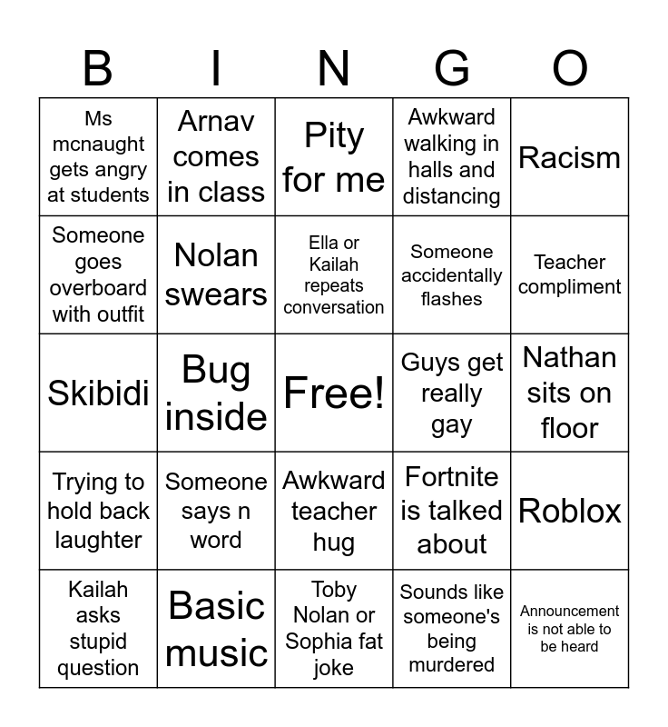 This bingo card has a free space and 24 words: Someone says n word, Basic music, Ella or Kailah repeats conversation, Kailah asks stupid question, Racism, Ms mcnaught gets angry at students, Someone goes overboard with outfit, Arnav comes in class, Guys get really gay, Awkward teacher hug, Someone accidentally flashes, Skibidi, Fortnite is talked about, Roblox, Nolan swears, Sounds like someone's being murdered, Nathan sits on floor, Pity for me, Teacher compliment, Bug inside, Announcement is not able to be heard, Trying to hold back laughter, Awkward walking in halls and distancing and Toby Nolan or Sophia fat joke.