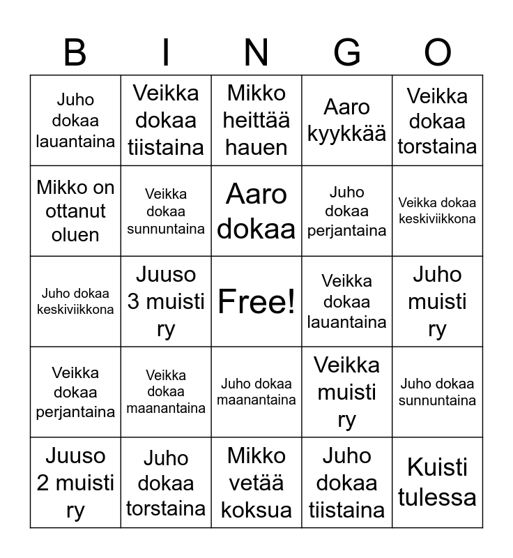 This bingo card has a free space and 24 words: Veikka dokaa maanantaina, Juho dokaa torstaina, Aaro dokaa, Juuso 2 muisti ry, Veikka dokaa torstaina, Juho dokaa lauantaina, Mikko on ottanut oluen, Veikka dokaa tiistaina, Veikka dokaa lauantaina, Juho dokaa maanantaina, Juho dokaa perjantaina, Juho dokaa keskiviikkona, Veikka muisti ry, Juho dokaa sunnuntaina, Veikka dokaa sunnuntaina, Juho dokaa tiistaina, Juho muisti ry, Mikko heittää hauen, Veikka dokaa keskiviikkona, Juuso 3 muisti ry, Kuisti tulessa, Veikka dokaa perjantaina, Aaro kyykkää and Mikko vetää koksua.