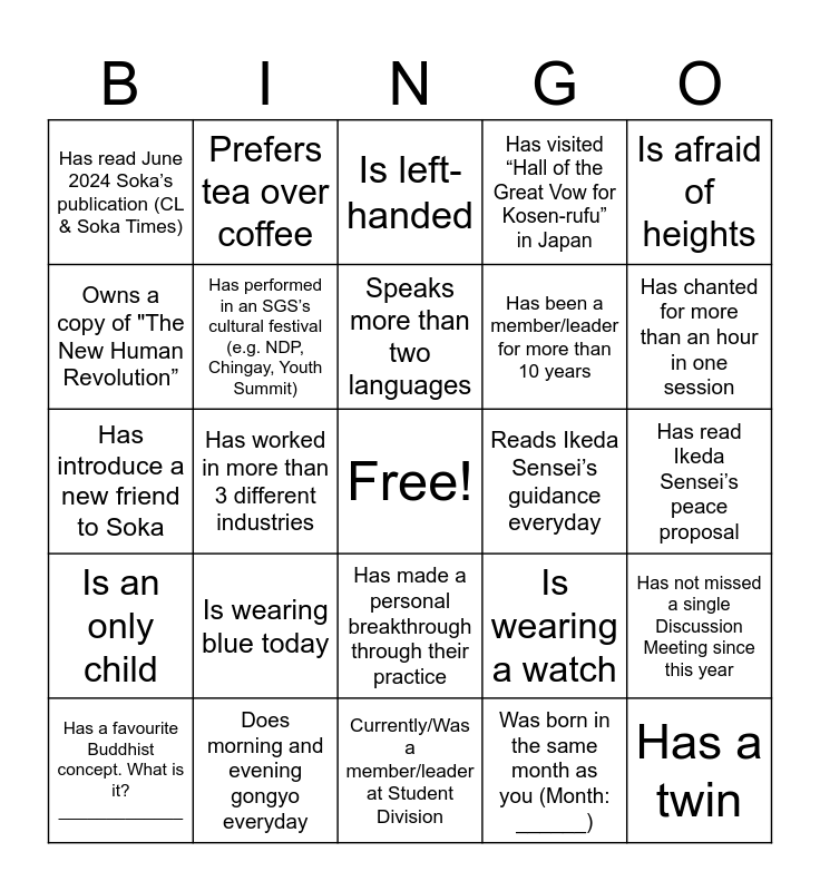 This bingo card has a free space and 28 words: Has travelled to more than 5 countries, Does morning and evening gongyo everyday, Speaks more than two languages, Was born in the same month as you (Month: ______), Is afraid of heights, Has read June 2024 Soka’s publication (CL & Soka Times), Has performed in an SGS’s cultural festival (e.g. NDP, Chingay, Youth Summit), Currently/Was a member/leader at Student Division, Reads Ikeda Sensei’s guidance everyday, Has not missed a single Discussion Meeting since this year, Has introduce a new friend to Soka, Has worked in more than 3 different industries, Is wearing a watch, Has a twin, Owns a copy of "The New Human Revolution”, Is a fortune baby, Has made a personal breakthrough through their practice, Has visited “Hall of the Great Vow for Kosen-rufu” in Japan, Has chanted for more than an hour in one session, Has a favourite Buddhist concept. What is it? _____________, Prefers tea over coffee, Was once a student at Soka Kindergarten (now known as Soka Pre-School), Has been a member/leader for more than 10 years, Has read Ikeda Sensei’s peace proposal, Is an only child, Is wearing blue today, Is left-handed and Currently/Was a member or IC in Future Division.