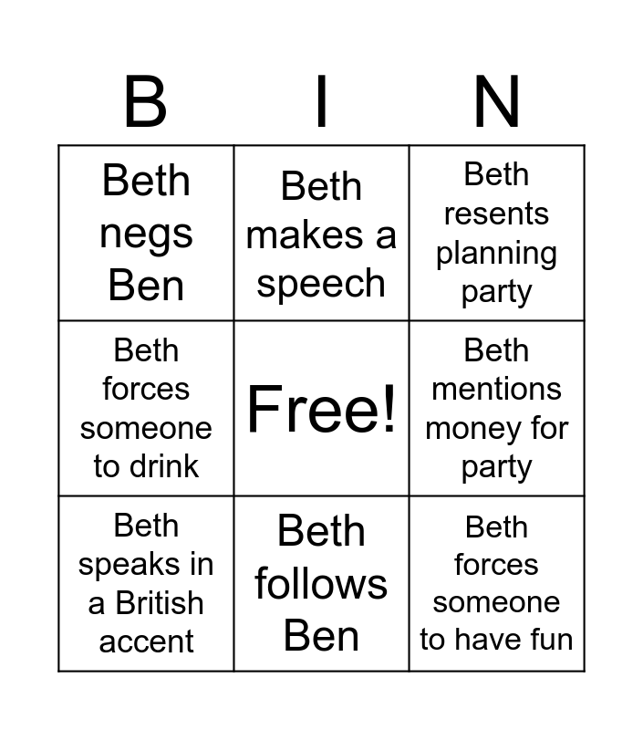 This bingo card has a free space and 10 words: Beth follows Ben, Beth resents planning party, Beth negs Ben, Beth forces someone to have fun, Beth forces someone to drink, Beth speaks in a British accent, Beth makes a speech, Beth declares friendship supremacy, Beth mentions money for party and Beth and adeeba get in an argument.
