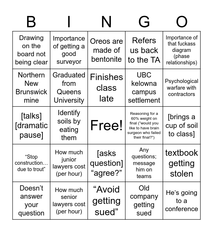 This bingo card has a free space and 24 words: How much junior lawyers cost (per hour), How much senior lawyers cost (per hour), Finishes class late, Doesn’t answer your question, Importance of that fuckass diagram (phase relationships), Drawing on the board not being clear, Northern New Brunswick mine, Importance of getting a good surveyor, Reasoning for a 60% weight on final (“would you like to have brain surgeon who failed their final?”), [asks question] “agree?”, UBC kelowna campus settlement, [talks] [dramatic pause], Any questions; message him on teams, textbook getting stolen, Graduated from Queens University, Old company getting sued, [brings a cup of soil to class], Oreos are made of bentonite, Psychological warfare with contractors, Identify soils by eating them, He’s going to a conference, “Stop construction… due to trout”, Refers us back to the TA and “Avoid getting sued”.