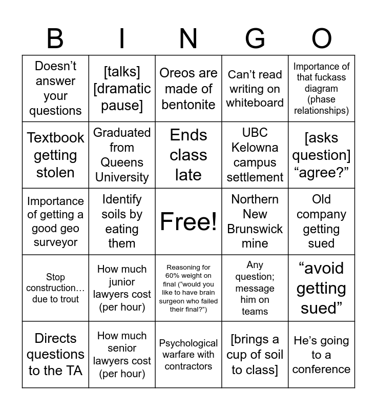 This bingo card has a free space and 24 words: How much junior lawyers cost (per hour), How much senior lawyers cost (per hour), Ends class late, Directs questions to the TA, Importance of that fuckass diagram (phase relationships), Doesn’t answer your questions, Textbook getting stolen, [talks] [dramatic pause], Northern New Brunswick mine, Reasoning for 60% weight on final (“would you like to have brain surgeon who failed their final?”), UBC Kelowna campus settlement, Importance of getting a good geo surveyor, Any question; message him on teams, “avoid getting sued”, Graduated from Queens University, [brings a cup of soil to class], Old company getting sued, Oreos are made of bentonite, [asks question] “agree?”, Identify soils by eating them, He’s going to a conference, Stop construction… due to trout, Can’t read writing on whiteboard and Psychological warfare with contractors.