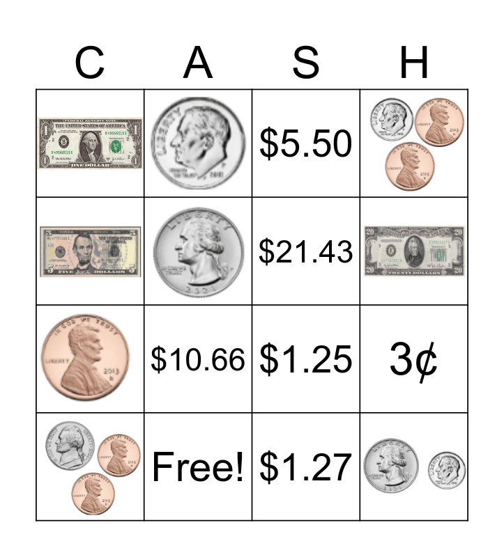 This bingo card has 15 images and 10 words: Free!, $1.25, 75¢, 15¢, $21.43, 88¢, $1.27, $5.50, $10.66 and 3¢.
