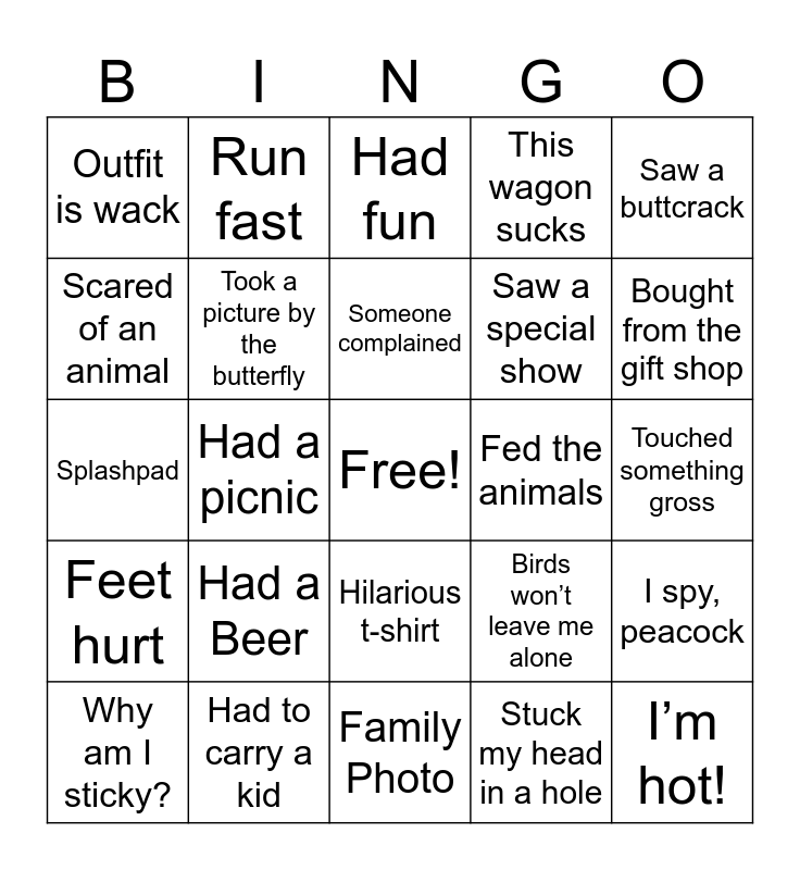 This bingo card has a free space and 24 words: Had a Beer, Had to carry a kid, Someone complained, Why am I sticky?, Saw a buttcrack, Outfit is wack, Scared of an animal, Run fast, Fed the animals, Hilarious t-shirt, Saw a special show, Splashpad, Birds won’t leave me alone, I spy, peacock, Took a picture by the butterfly, Stuck my head in a hole, Touched something gross, Had fun, Bought from the gift shop, Had a picnic, I’m hot!, Feet hurt, This wagon sucks and Family Photo.