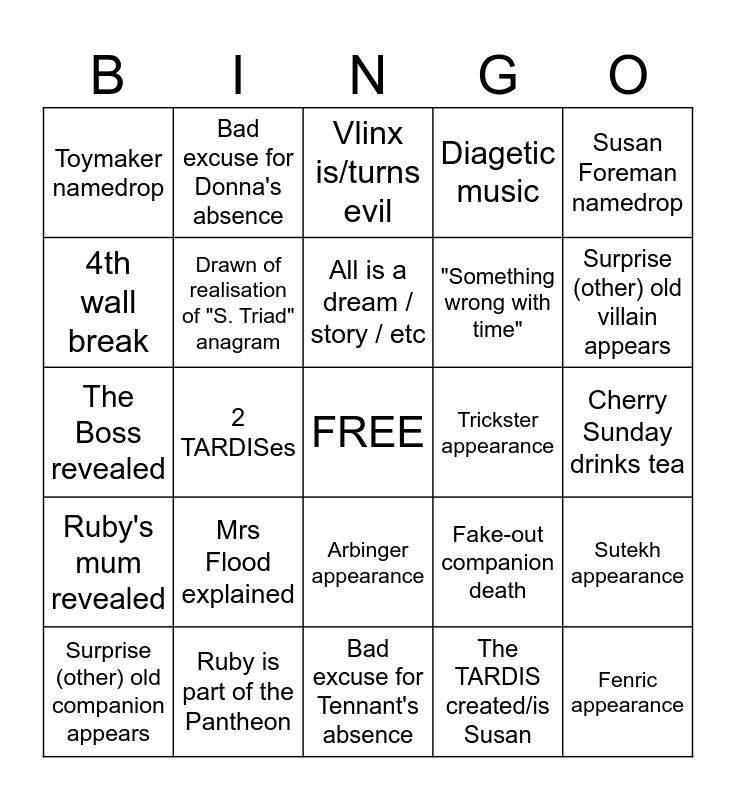 This bingo card has a free space and 24 words: Mrs Flood explained, Ruby is part of the Pantheon, All is a dream / story / etc, Surprise (other) old companion appears, Susan Foreman namedrop, Toymaker namedrop, 4th wall break, Bad excuse for Donna's absence, Trickster appearance, Arbinger appearance, "Something wrong with time", The Boss revealed, Fake-out companion death, Sutekh appearance, Drawn of realisation of "S. Triad" anagram, The TARDIS created/is Susan, Cherry Sunday drinks tea, Vlinx is/turns evil, Surprise (other) old villain appears, 2 TARDISes, Fenric appearance, Ruby's mum revealed, Diagetic music and Bad excuse for Tennant's absence.