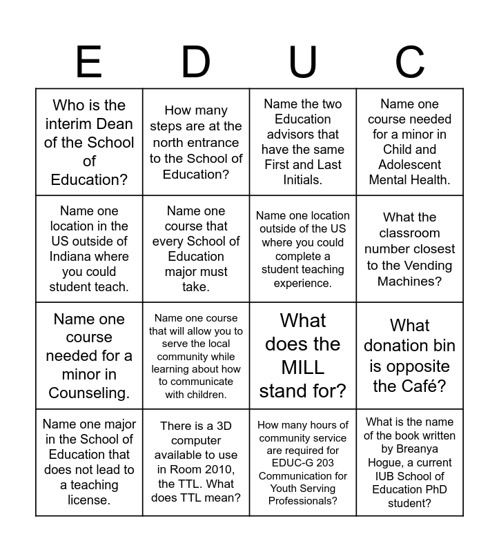 This bingo card has 33 words: Find the squirrel on the NSO welcome sign by the front desk in Suite 1000. What is the squirrel wearing?, What does the sign in the elevator say?, What donation bin is opposite the Café?, What are the 3 languages available to be counseled in at the Center for Human Growth?, What is the name of the book written by Breanya Hogue, a current IUB School of Education PhD student?, Name one location outside of the US where you could complete a student teaching experience., Name one location in the US outside of Indiana where you could student teach., What are the 3 languages that the Executive Director of Students Success knows?, How many steps are at the north entrance to the School of Education?, Name one course available for the Educator Well-Being Distinction., What the classroom number closest to the Vending Machines?, Name the two Education advisors that have the same First and Last Initials., There is a study space for students in Room 2011, opposite the TTL. What is Room 2011’s max occupancy?, What office (room number or person’s name) is located directly opposite the all-gender restroom?, There is a 3D computer available to use in Room 2010, the TTL. What does TTL mean?, Name one course that will allow you to serve the local community while learning about how to communicate with children., Who is the Assistant Dean of Diversity, Equity, and Inclusion?, What does the MILL stand for?, Name one piece of equipment that can be found in the MILL., The MILL is located in 2260. What material is their QR code printed on?, There is an open study space on the 3rd floor to study. What is the name of the board that has “Shout Outs?”, What is the job placement percent of School of Education graduates?, Who is the interim Dean of the School of Education?, How many hours of community service are required for EDUC-G 203 Communication for Youth Serving Professionals?, What is the URL where you can apply for School of Education scholarships?, Name one major in the School of Education that does not lead to a teaching license., Name one course needed for a minor in Child and Adolescent Mental Health., Name one course needed for a minor in Counseling., Name one course that every School of Education major must take., Name one course available for the Professional Distinction., What is the typical maximum class size for courses in the School of Education? (count the number of seats in room ___), What is the room number of the School of Education Auditorium? and Which direction (North, East, South, West) is the East Parking Garage from where you are currently?.