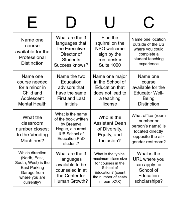 This bingo card has 34 words: Free!, What is the job placement percent of School of Education graduates?, Who is the interim Dean of the School of Education?, How many hours of community service are required for EDUC-G 203 Communication for Youth Serving Professionals?, What is the URL where you can apply for School of Education scholarships?, Name one major in the School of Education that does not lead to a teaching license, Name one course needed for a minor in Child and Adolescent Mental Health, Name one course needed for a minor in Counseling, What are the 3 languages that the Executive Director of Students Success knows?, How many steps are at the north entrance to the School of Education?, Name one course available for the Educator Well-Being Distinction, Find the squirrel on the NSO welcome sign by the front desk in Suite 1000, What does the sign in the elevator say?, What donation bin is opposite the Café?, What are the 3 languages available to be counseled in at the Center for Human Growth?, What is the name of the book written by Breanya Hogue, a current IUB School of Education PhD student?, Name one course that will allow you to serve the local community while learning about how to communicate with children, Who is the Assistant Dean of Diversity, Equity, and Inclusion?, What does the MILL stand for?, Name one piece of equipment that can be found in the MILL, The MILL is located in 2260., There is an open study space on the 3rd floor to study., Name one course available for the Professional Distinction, What is the typical maximum class size for courses in the School of Education? (count the number of seats in room XXX), What is the room number of the School of Education Auditorium?, Which direction (North, East, South, West) is the East Parking Garage from where you are currently?, Name one location outside of the US where you could complete a student teaching experience, Name one location in the US outside of Indiana where you could student teach, What the classroom number closest to the Vending Machines?, Name the two Education advisors that have the same First and Last Initials, There is a study space for students in Room 2011, opposite the TTL., What office (room number or person’s name) is located directly opposite the all-gender restroom?, There is a 3D computer available to use in Room 2010, the TTL. and Name one course that every School of Education major must take.