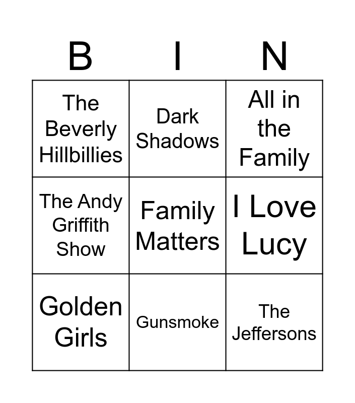 This bingo card has a free space and 8 words: I Love Lucy, All in the Family, Dark Shadows, Golden Girls, The Beverly Hillbillies, The Jeffersons, The Andy Griffith Show and Gunsmoke.