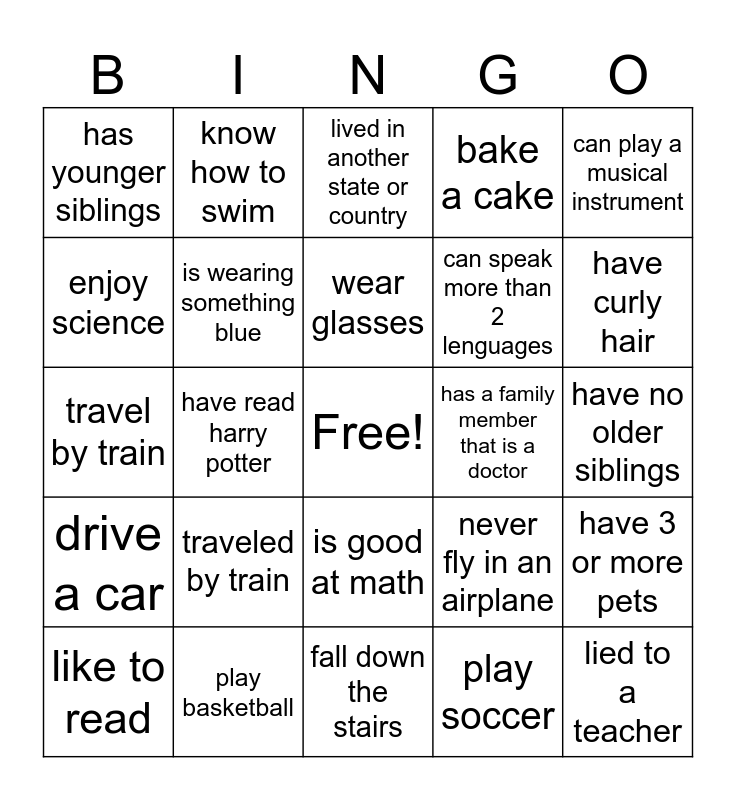 This bingo card has a free space and 24 words: traveled by train, play basketball, wear glasses, like to read, can play a musical instrument, has younger siblings, enjoy science, know how to swim, has a family member that is a doctor, is good at math, can speak more than 2 lenguages, travel by train, never fly in an airplane, have 3 or more pets, is wearing something blue, play soccer, have no older siblings, lived in another state or country, have curly hair, have read harry potter, lied to a teacher, drive a car, bake a cake and fall down the stairs.