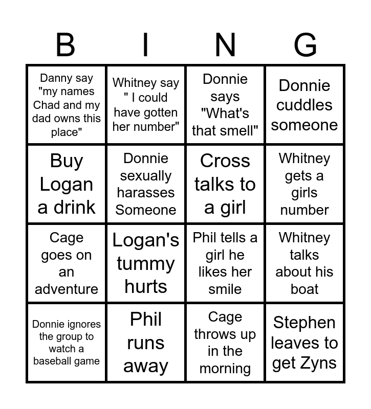 This bingo card has 16 words: Phil runs away, Whitney talks about his boat, Donnie says "What's that smell", Danny say "my names Chad and my dad owns this place", Cage goes on an adventure, Whitney say " I could have gotten her number", Phil tells a girl he likes her smile, Cage throws up in the morning, Buy Logan a drink, Donnie sexually harasses Someone, Donnie ignores the group to watch a baseball game, Donnie cuddles someone, Logan's tummy hurts, Whitney gets a girls number, Cross talks to a girl and Stephen leaves to get Zyns.