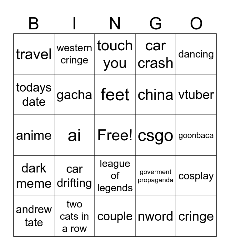 This bingo card has a free space and 24 words: car drifting, two cats in a row, feet, andrew tate, dancing, travel, todays date, western cringe, csgo, league of legends, china, anime, goverment propaganda, cosplay, gacha, nword, goonbaca, touch you, vtuber, ai, cringe, dark meme, car crash and couple.