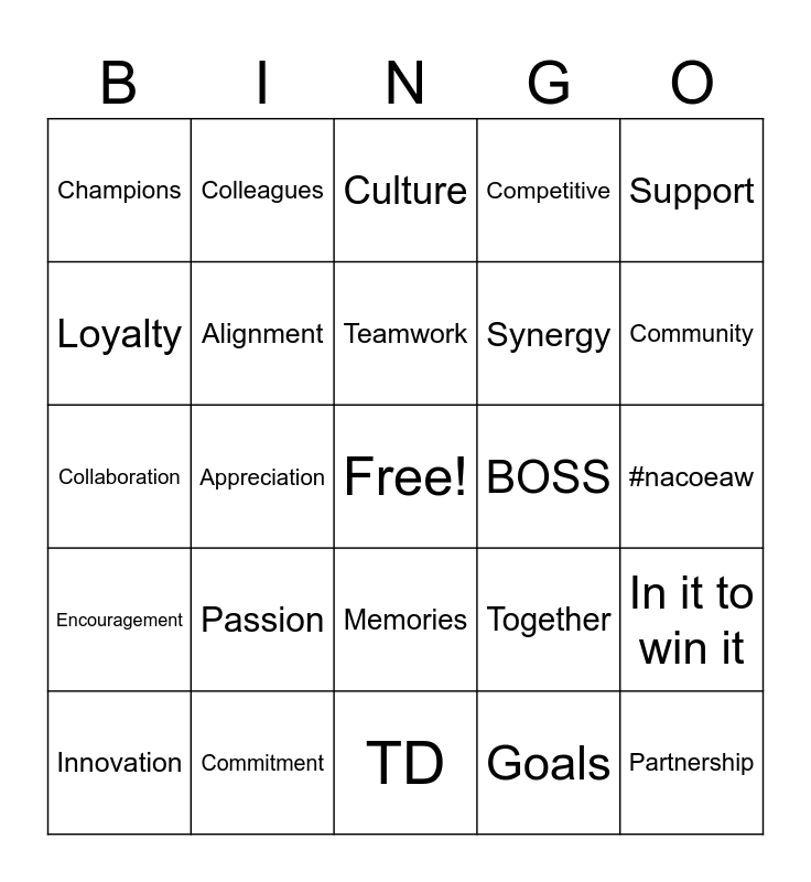 This bingo card has a free space and 24 words: Passion, Commitment, Teamwork, Innovation, Support, Champions, Loyalty, Colleagues, BOSS, Memories, Synergy, Collaboration, Together, In it to win it, Alignment, Goals, #nacoeaw, Culture, Community, Appreciation, Partnership, Encouragement, Competitive and TD.