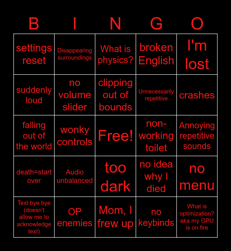 This bingo card has a free space and 35 words: graphic glitches, laggy gameplay, audio out of sync, no volume slider, too dark, broken English, suddenly loud, suddenly quiet, clipping out of bounds, Screen tearing, falling out of the world, I'm lost, missing barriers, "I lost my sh*t", settings reset, non-working toilet, no keybinds, wonky controls, death=start over, What is optimization? aka my GPU is on fire, no idea why I died, Text bye bye (doesn't allow me to acknowledge text), no menu, OP enemies, What is physics?, crashes, Invisible walls, Unfinished game, Unnecessarily repetitive, Annoying repetitive sounds, Broken save system, Mom, I frew up, Audio unbalanced, Disappearing surroundings and You spin me right round-mouse sensitivity way too high.