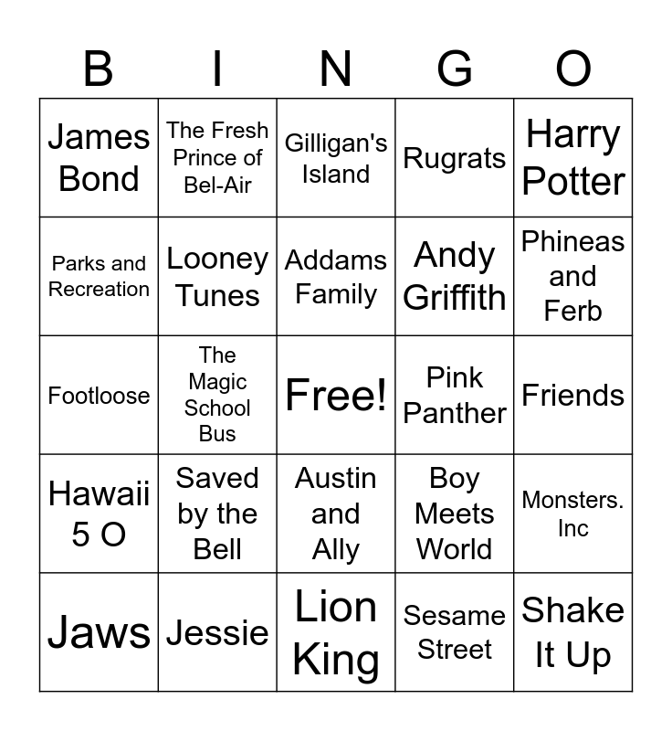 This bingo card has a free space and 24 words: Saved by the Bell, Jessie, Addams Family, Jaws, Harry Potter, James Bond, Parks and Recreation, The Fresh Prince of Bel-Air, Pink Panther, Austin and Ally, Andy Griffith, Footloose, Boy Meets World, Monsters. Inc, Looney Tunes, Sesame Street, Friends, Gilligan's Island, Phineas and Ferb, The Magic School Bus, Shake It Up, Hawaii 5 O, Rugrats and Lion King.