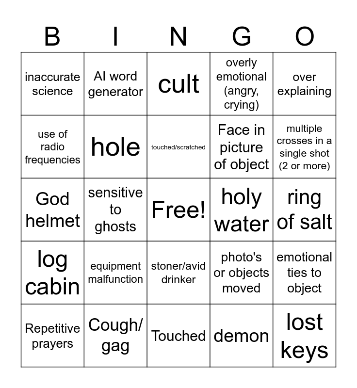 This bingo card has a free space and 42 words: energy/presence, touched/scratched, room temp, equipment malfunction, demon, emotional ties to object, lost keys, possession, cult, stoner/avid drinker, ring of salt, multiple crosses in a single shot (2 or more), sensitive to ghosts, over explaining, have to bring in a priest, photo's or objects moved, mentions a burning feeling, God helmet, Ghost "orbs", AI word generator, use of radio frequencies, secret passage, full story not told, inaccurate science, Religious talisman, Pain in throat/ chest, Face in picture of object, Ghosts speak through a person, Face peeking, Exorcism, Dead animal corpse, log cabin, hole, Touched, Don't look into eyes, Repetitive prayers, Cough/ gag, holy water, Praying hurts, Emotional baggage, overly emotional (angry, crying) and EVP session.