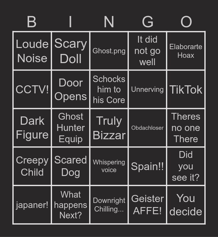 This bingo card has 25 words: Creepy Child, What happens Next?, Truly Bizzar, Geister AFFE!, Elaborarte Hoax, Loude Noise, Scary Doll, Ghost.png, Obdachloser, Did you see it?, CCTV!, Door Opens, Downright Chilling..., Spain!!, TikTok, japaner!, Ghost Hunter Equip, Schocks him to his Core, Unnerving, Theres no one There, Dark Figure, Scared Dog, Whispering voice, It did not go well and You decide.