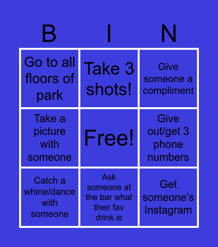 This bingo card has a free space and 8 words: Give out/get 3 phone numbers, Give someone a compliment, Take 3 shots!, Catch a whine/dance with someone, Go to all floors of park, Get someone’s Instagram, Take a picture with someone and Ask someone at the bar what their fav drink is.