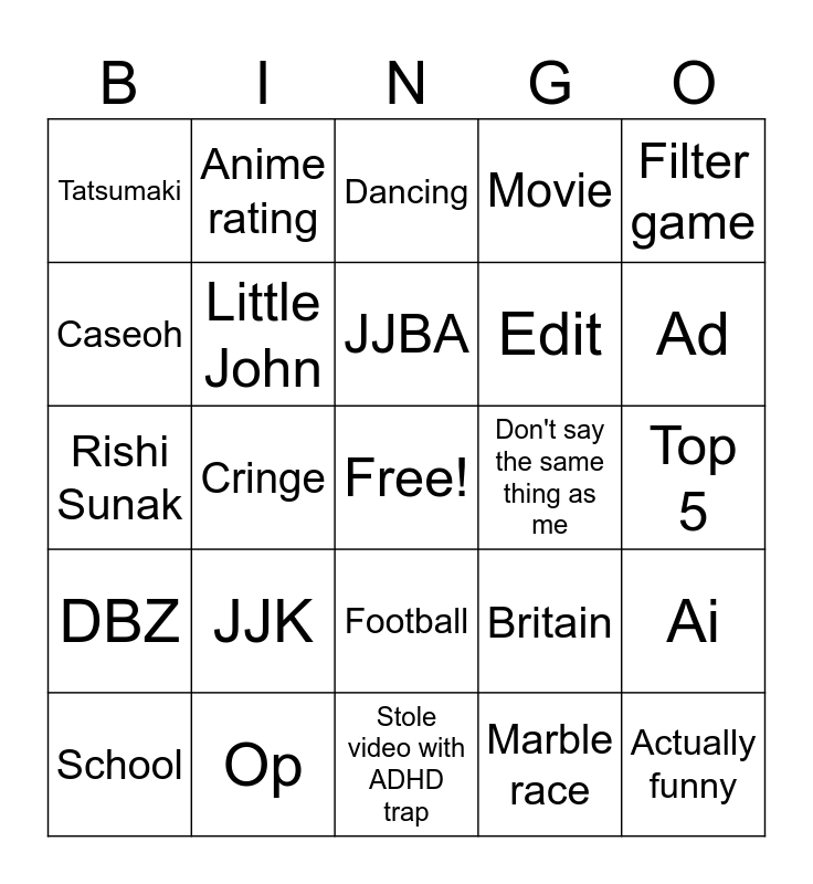 This bingo card has a free space and 24 words: JJK, Op, JJBA, School, Filter game, Tatsumaki, Caseoh, Anime rating, Don't say the same thing as me, Football, Edit, Rishi Sunak, Britain, Ai, Little John, Marble race, Top 5, Dancing, Ad, Cringe, Actually funny, DBZ, Movie and Stole video with ADHD trap.