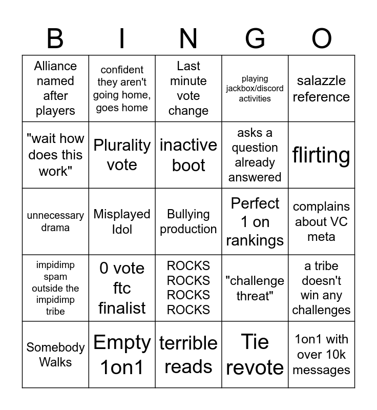 This bingo card has 29 words: Somebody Walks, #1 Contender goes home, Misplayed Idol, 1on1 with over 10k messages, Alliance named after players, Last minute vote change, Plurality vote, 0 vote ftc finalist, Perfect 1 on rankings, Empty 1on1, complains about VC meta, Bullying production, terrible reads, Tie revote, flirting, OG tribe has 1 person make merge, ROCKS ROCKS ROCKS ROCKS, impidimp spam outside the impidimp tribe, salazzle reference, unnecessary drama, "challenge threat", unplayed advantage, asks a question already answered, "wait how does this work", playing jackbox/discord activities, confident they aren't going home, goes home, a tribe doesn't win any challenges, inactive boot and overplays & gets voted out.