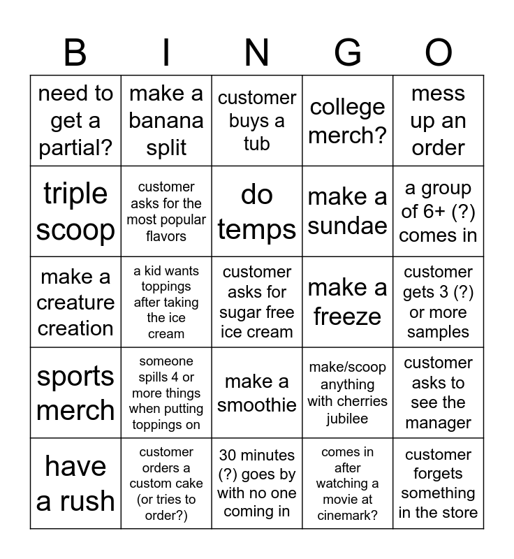 This bingo card has 25 words: someone spills 4 or more things when putting toppings on, 30 minutes (?) goes by with no one coming in, do temps, have a rush, mess up an order, need to get a partial?, triple scoop, make a banana split, make a freeze, make a smoothie, make a sundae, make a creature creation, make/scoop anything with cherries jubilee, customer asks to see the manager, customer asks for the most popular flavors, customer forgets something in the store, customer gets 3 (?) or more samples, customer buys a tub, a group of 6+ (?) comes in, a kid wants toppings after taking the ice cream, customer asks for sugar free ice cream, customer orders a custom cake (or tries to order?), sports merch, college merch? and comes in after watching a movie at cinemark?.