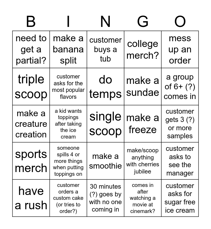 This bingo card has a free space and 25 words: someone spills 4 or more things when putting toppings on, 30 minutes (?) goes by with no one coming in, do temps, have a rush, mess up an order, need to get a partial?, triple scoop, make a banana split, make a freeze, make a smoothie, make a sundae, make a creature creation, make/scoop anything with cherries jubilee, customer asks to see the manager, customer asks for the most popular flavors, customer forgets something in the store, customer gets 3 (?) or more samples, customer buys a tub, a group of 6+ (?) comes in, a kid wants toppings after taking the ice cream, customer asks for sugar free ice cream, customer orders a custom cake (or tries to order?), sports merch, college merch? and comes in after watching a movie at cinemark?.