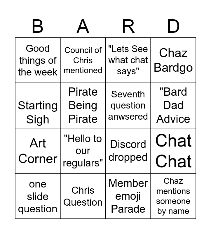This bingo card has 16 words: Chris Question, Chat Chat, "Lets See what chat says", Good things of the week, Art Corner, Council of Chris mentioned, Discord dropped, Member emoji Parade, Starting Sigh, Pirate Being Pirate, one slide question, Chaz Bardgo, "Hello to our regulars", "Bard Dad Advice, Seventh question anwsered and Chaz mentions someone by name.
