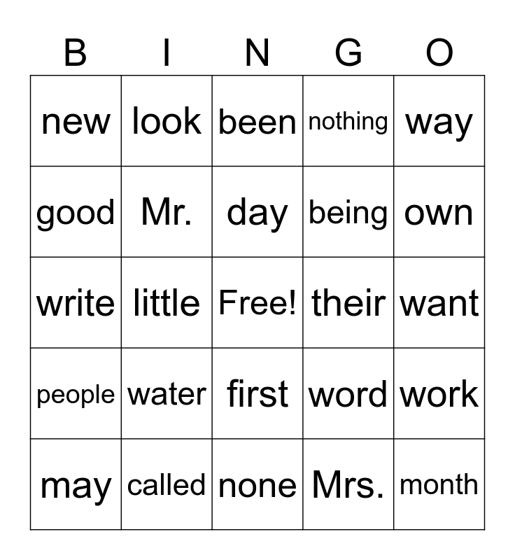 This bingo card has a free space and 24 words: water, called, day, may, way, new, good, look, their, first, being, write, word, work, Mr., Mrs., want, been, own, little, month, people, nothing and none.