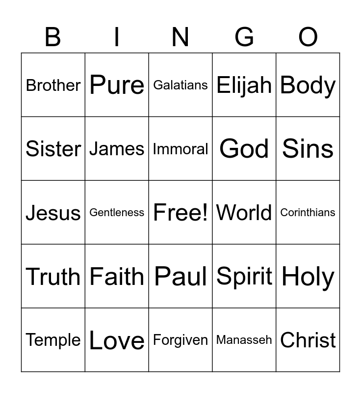 This bingo card has a free space and 24 words: Faith, Love, Immoral, Temple, Body, Brother, Sister, Pure, World, Paul, God, Jesus, Spirit, Holy, James, Manasseh, Corinthians, Galatians, Sins, Gentleness, Christ, Truth, Elijah and Forgiven.