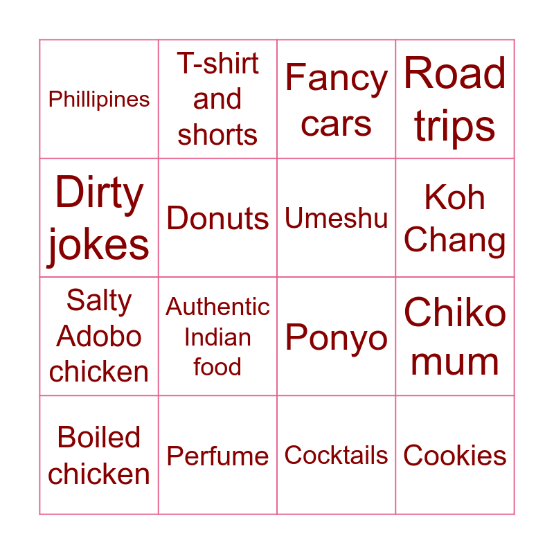 This bingo card has 20 words: Chiko mum, Matcha, Fancy cars, Cakes, Boiled chicken, Dirty jokes, Perfume, Phillipines, Salty Adobo chicken, T-shirt and shorts, Authentic Indian food, Ponyo, Donuts, Cookies, Umeshu, Let’s drink!, Koh Chang, Road trips, Cocktails and Palabok.