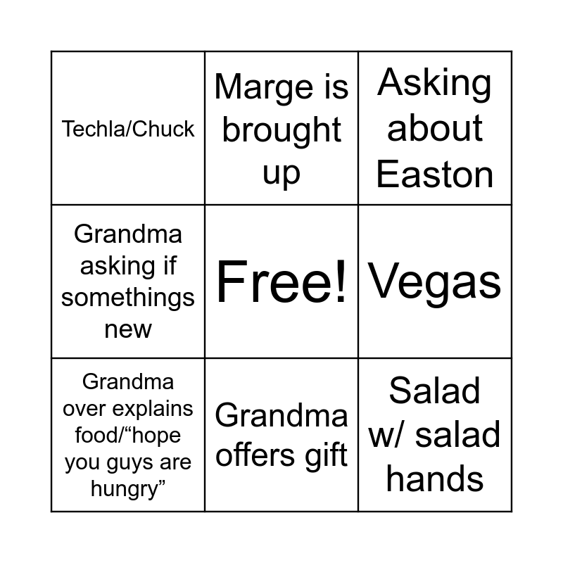 This bingo card has a free space and 8 words: Vegas, Asking about Easton, Marge is brought up, Grandma over explains food/“hope you guys are hungry”, Techla/Chuck, Salad w/ salad hands, Grandma asking if somethings new and Grandma offers gift.