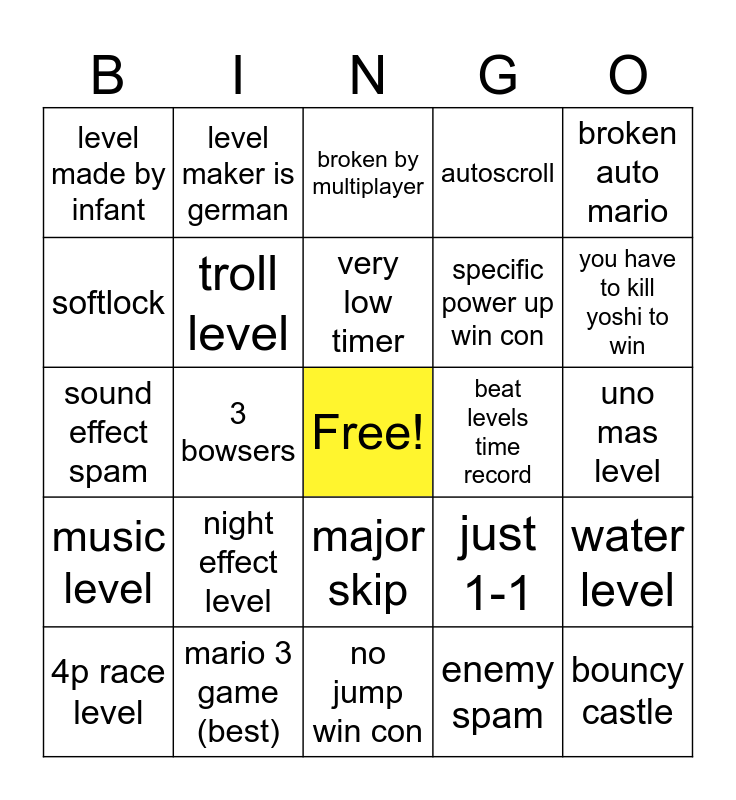 This bingo card has a free space and 24 words: night effect level, mario 3 game (best), very low timer, 4p race level, broken auto mario, level made by infant, softlock, level maker is german, beat levels time record, major skip, specific power up win con, sound effect spam, just 1-1, water level, troll level, enemy spam, uno mas level, broken by multiplayer, you have to kill yoshi to win, 3 bowsers, bouncy castle, music level, autoscroll and no jump win con.
