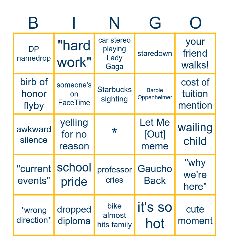 This bingo card has a free space and 24 words: school pride, dropped diploma, Starbucks sighting, *wrong direction*, your friend walks!, DP namedrop, birb of honor flyby, "hard work", Let Me [Out] meme, professor cries, Barbie Oppenheimer, awkward silence, Gaucho Back, "why we're here", someone's on FaceTime, it's so hot, wailing child, car stereo playing Lady Gaga, cost of tuition mention, yelling for no reason, cute moment, "current events", staredown and bike almost hits family.