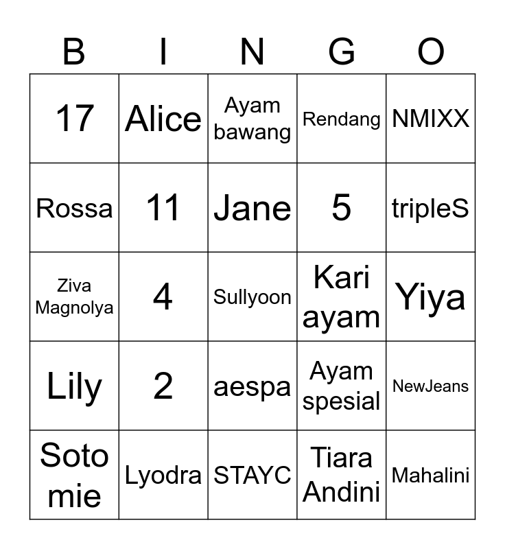 This bingo card has a free space and 24 words: 2, Lyodra, Jane, Soto mie, NMIXX, 17, Rossa, Alice, Kari ayam, aespa, 5, Ziva Magnolya, Ayam spesial, NewJeans, 11, Tiara Andini, Yiya, Ayam bawang, tripleS, 4, Mahalini, Lily, Rendang and STAYC.