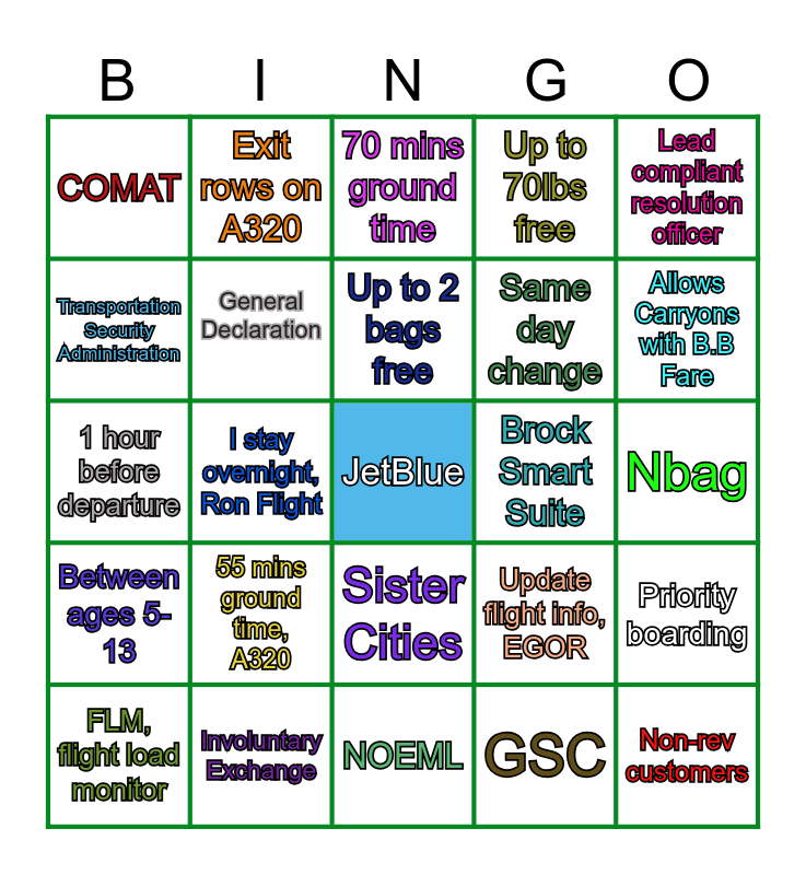 This bingo card has a free space and 24 words: 55 mins ground time, A320, Involuntary Exchange, Up to 2 bags free, FLM, flight load monitor, Lead compliant resolution officer, COMAT, Transportation Security Administration, Exit rows on A320, Brock Smart Suite, Sister Cities, Same day change, 1 hour before departure, Update flight info, EGOR, Priority boarding, General Declaration, GSC, Nbag, 70 mins ground time, Allows Carryons with B.B Fare, I stay overnight, Ron Flight, Non-rev customers, Between ages 5-13, Up to 70lbs free and NOEML.