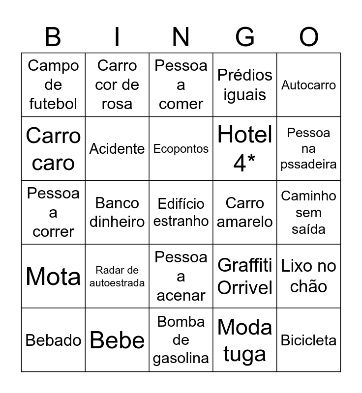 This bingo card has 35 words: Casa abandonada, Buraco na estrada, Avião, Acidente, Pessoa a acenar, Prédios iguais, Carro caro, Bandeira de Portugal, Ecopontos, Animais, Pessoa a correr, Autocarro, Portugal, Restaurante fast food, Campo de futebol, Carro amarelo, Moda tuga, Banco dinheiro, Mota, Edifício estranho, Graffiti Orrivel, Bebado, Lixo no chão, Bebe, Pessoa a comer, Pessoa na pssadeira, Bicicleta, Caminhão, Hotel 4*, Caminho sem saída, Carro antigo, Bomba de gasolina, Radar de autoestrada, Carro cor de rosa and Bandeira de outro pais.