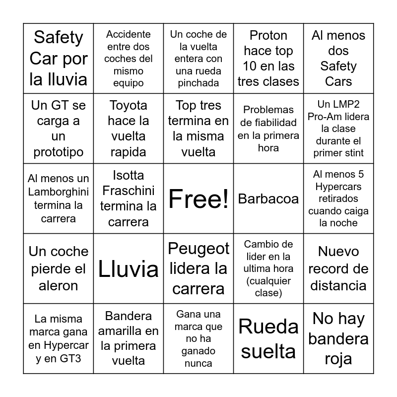 This bingo card has a free space and 24 words: Lluvia, Bandera amarilla en la primera vuelta, Top tres termina en la misma vuelta, La misma marca gana en Hypercar y en GT3, Al menos dos Safety Cars, Safety Car por la lluvia, Un GT se carga a un prototipo, Accidente entre dos coches del mismo equipo, Barbacoa, Peugeot lidera la carrera, Problemas de fiabilidad en la primera hora, Al menos un Lamborghini termina la carrera, Cambio de lider en la ultima hora (cualquier clase), Nuevo record de distancia, Toyota hace la vuelta rapida, Rueda suelta, Al menos 5 Hypercars retirados cuando caiga la noche, Un coche de la vuelta entera con una rueda pinchada, Un LMP2 Pro-Am lidera la clase durante el primer stint, Isotta Fraschini termina la carrera, No hay bandera roja, Un coche pierde el aleron, Proton hace top 10 en las tres clases and Gana una marca que no ha ganado nunca.