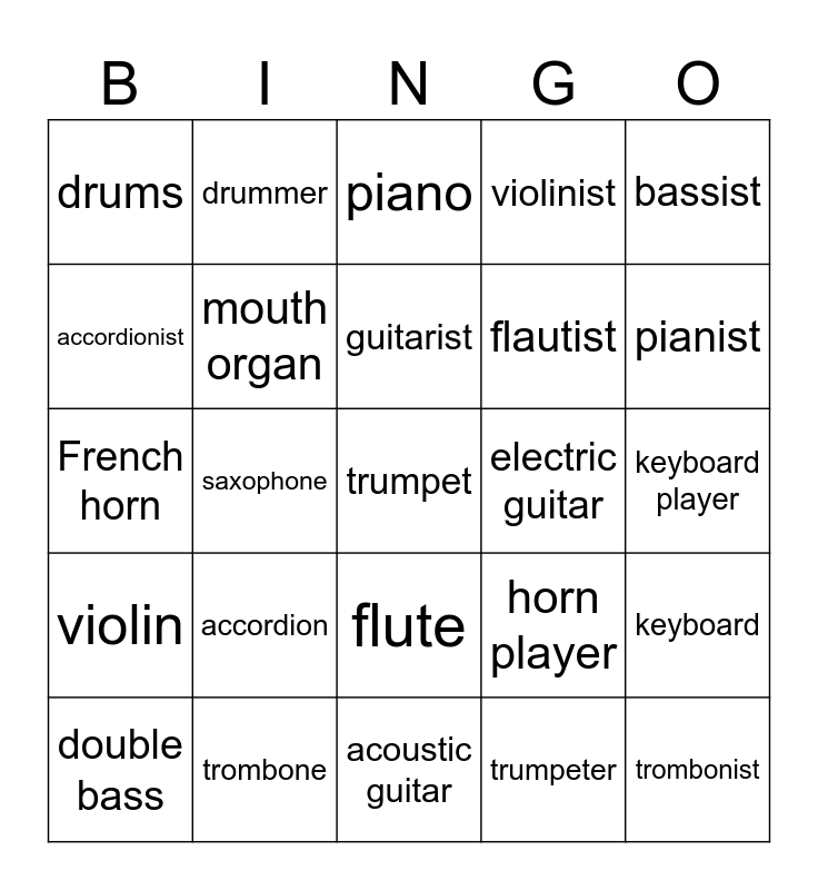 This bingo card has 25 words: accordion, acoustic guitar, guitarist, double bass, bassist, drums, accordionist, drummer, electric guitar, flute, flautist, French horn, horn player, keyboard, mouth organ, trombonist, keyboard player, piano, pianist, saxophone, trumpet, trombone, violin, violinist and trumpeter.