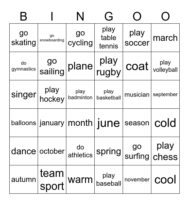 This bingo card has 36 words: spring, do athletics, play baseball, do gymnastics, balloons, play basketball, go sailing, warm, play soccer, go surfing, play volleyball, play table tennis, play chess, play hockey, play rugby, go skating, dance, musician, singer, go cycling, play badminton, january, june, month, season, go snowboarding, coat, team sport, plane, march, cool, autumn, cold, september, october and november.