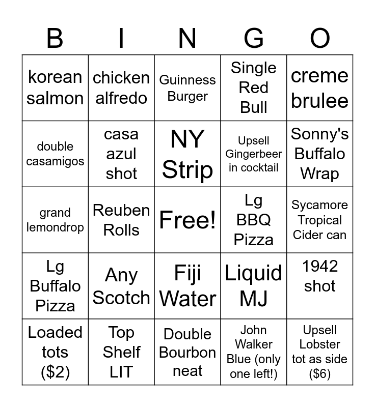 This bingo card has a free space and 24 words: Any Scotch, Top Shelf LIT, NY Strip, Loaded tots ($2), creme brulee, korean salmon, double casamigos, chicken alfredo, Lg BBQ Pizza, Fiji Water, Upsell Gingerbeer in cocktail, grand lemondrop, Liquid MJ, 1942 shot, casa azul shot, John Walker Blue (only one left!), Sycamore Tropical Cider can, Guinness Burger, Sonny's Buffalo Wrap, Reuben Rolls, Upsell Lobster tot as side ($6), Lg Buffalo Pizza, Single Red Bull and Double Bourbon neat.
